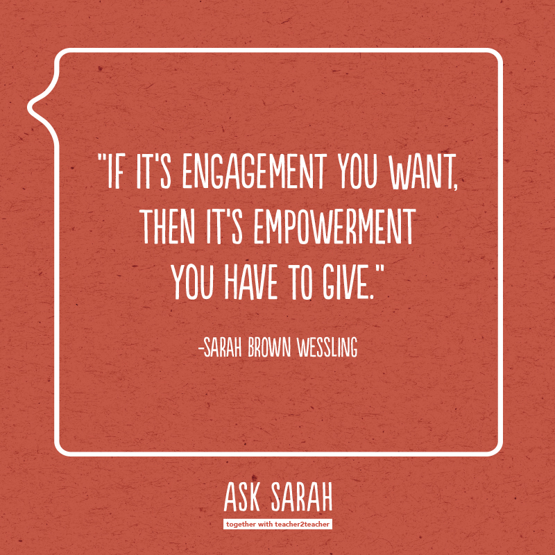 They will care when it’s more about them than you. This is especially tough when you’re just starting as a teacher because you’re worried about everything. You’re worried if the handout makes sense, you’re worried about taking attendance, you’re worried about not making mistakes or teaching something wrong. And while this is all perfectly normal and a phase of the craft that everyone goes through, it’s also the phase that’s more about you than them. But even while you’re working to cross over to the other, more student-centered, side of teaching, there are ways you can start to release the learning process over to them now. Think about creating productive group work instead of having them take notes on what you say. Create a problem for them to solve and have them come up with their own questions whenever you can. They will care when they own their learning. And even though I’m sure you’re nervous about turning that learning over to them, if it’s engagement you want, then it’s empowerment you have to give.