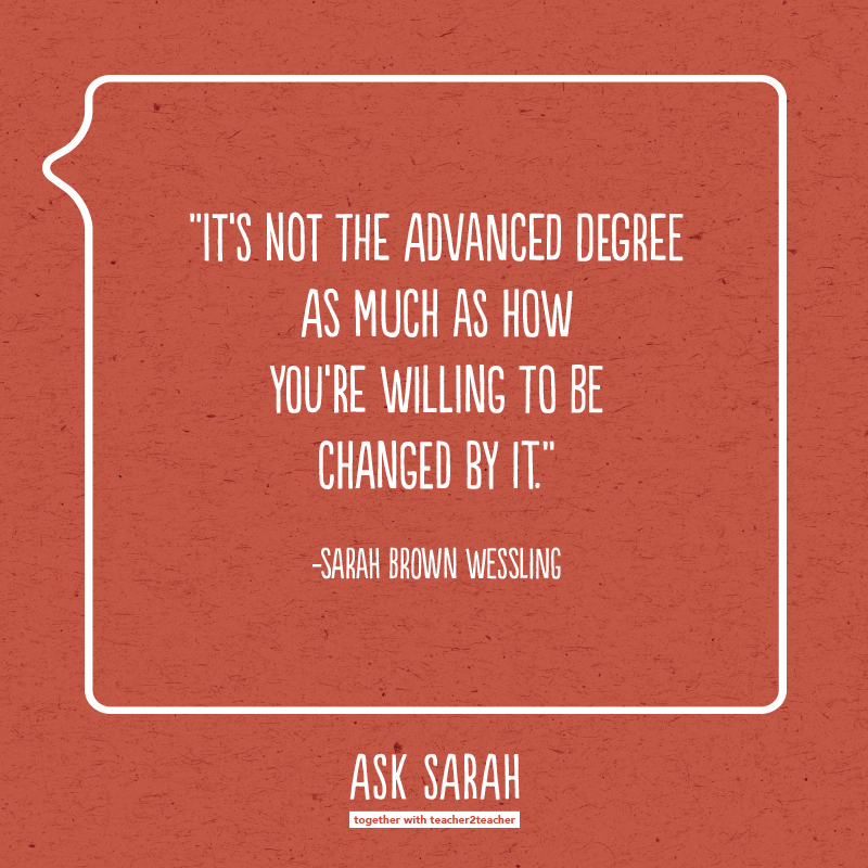 Believe me, I’m a huge proponent of educators continuing their education. I still really want that next degree. Many of my best friends and most respected colleagues have them or are getting them. But when you choose to do, do it for the right reasons because it’s not the advanced degree as much as how you’re willing to be changed by it.