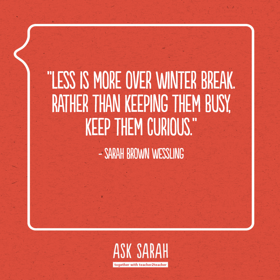 So as you’re thinking about winter break and trying to avoid the slump of time away from the classroom, think less about intensity and more about the meaningful. Have your students read, listen, and talk. That’s learning too! Remember, less is more over winter break. Rather than keeping them busy, keep them curious.